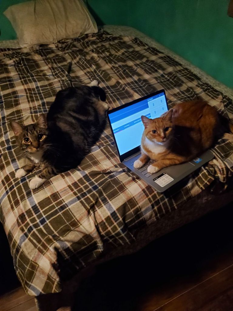 Oscar, our chief deep thinker and designerSmeagol, coding wizard and lead singer and yodelerDusty Rose, in charge of being very pretty, also good on typing and keyboards Harley Bean, CEO, taking a well deserved napStriker (HR Director) discusses inappropriate touching with Oscar.Ford Prefect aka Jared McLaughlin, food bearing ape-like creature, serves the furry overlords, and gets to pay for things. Does other menial chores.